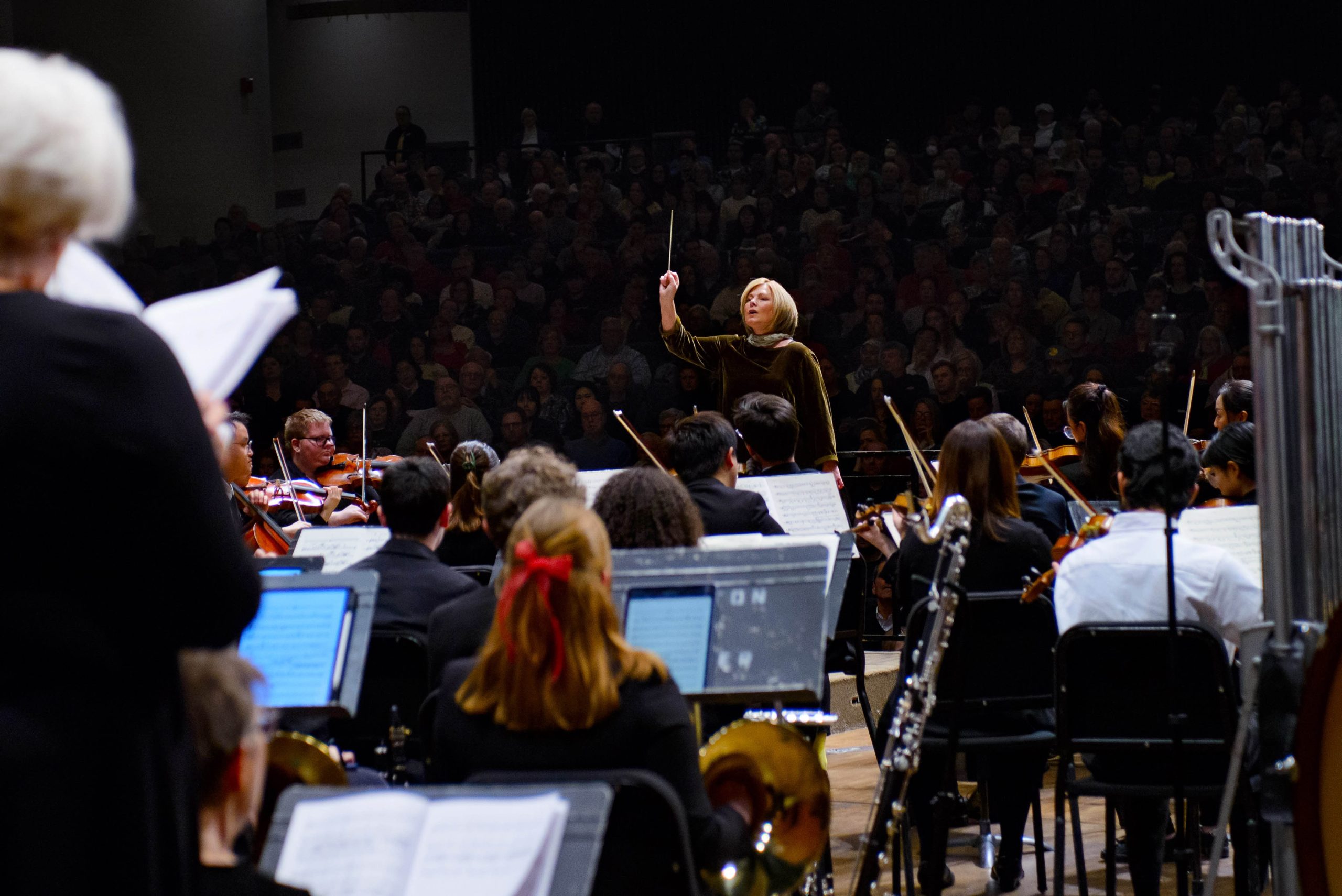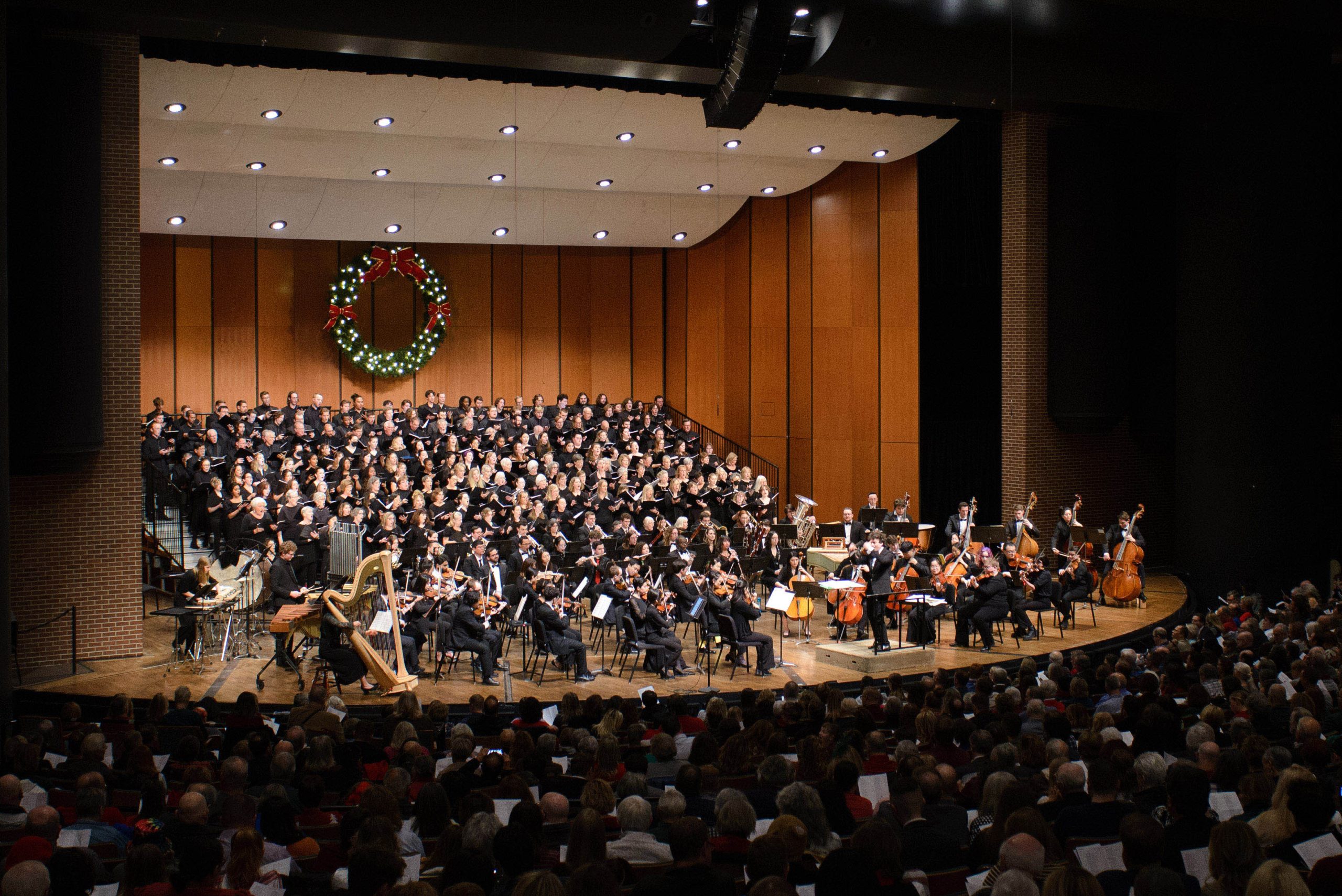 The MSU Symphony Orchestra and combined choirs perform in Wharton Center for the annual holiday concert, bringing together more than 270 musicians to fill the Cobb Great Hall stage.